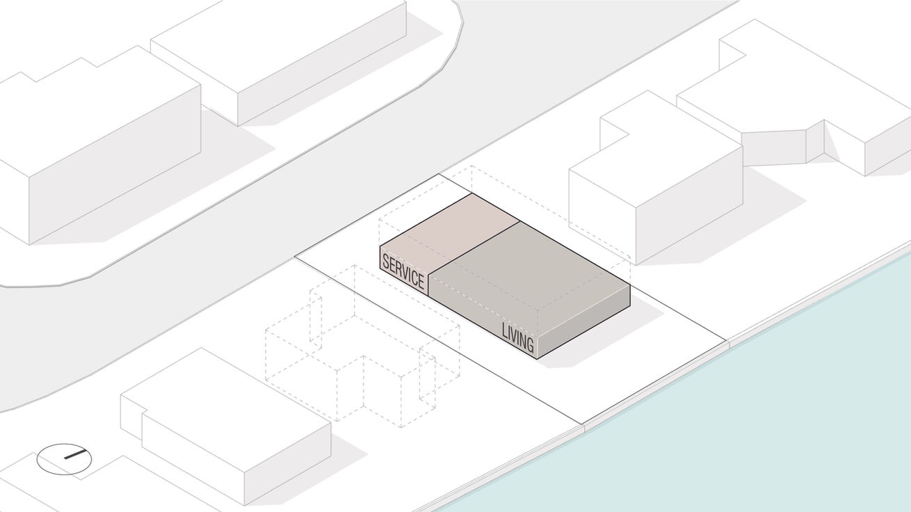 O contato direto com a água é explorado através do recuo do volume da edificação, ampliando ao máximo a área externa disponível nos fundos.