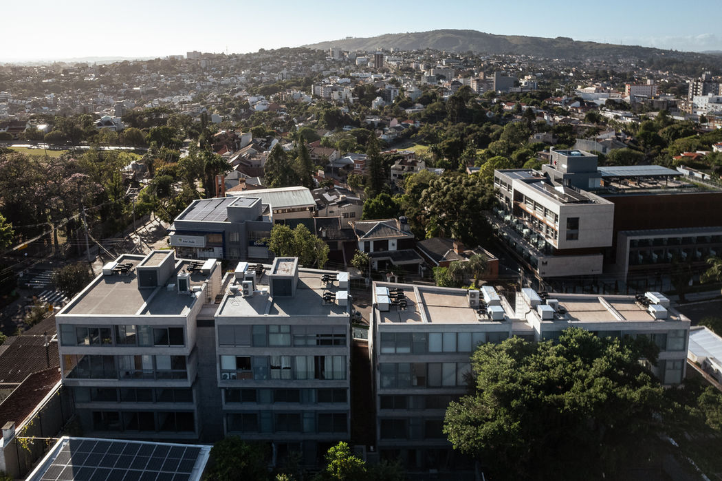 A volumetria do projeto é fruto da ideia de seguir o padrão geométrico do entorno: os quatro lotes existentes são base para quatro blocos, cada qual com quatro apartamentos escalonados. Tal escalonamento não é formalista: a edição do prisma original reduz o impacto da edificação na região, afastando-a da via pública a cada pavimento, além de acompanhar a topografia original do terreno e gerar terraços privativos com piscinas lineares. Entre os pavimentos, ora a frente do apartamento é paralela à via em frente, ora perpendicular à divisa lateral, criando dinamismo para os volumes.
