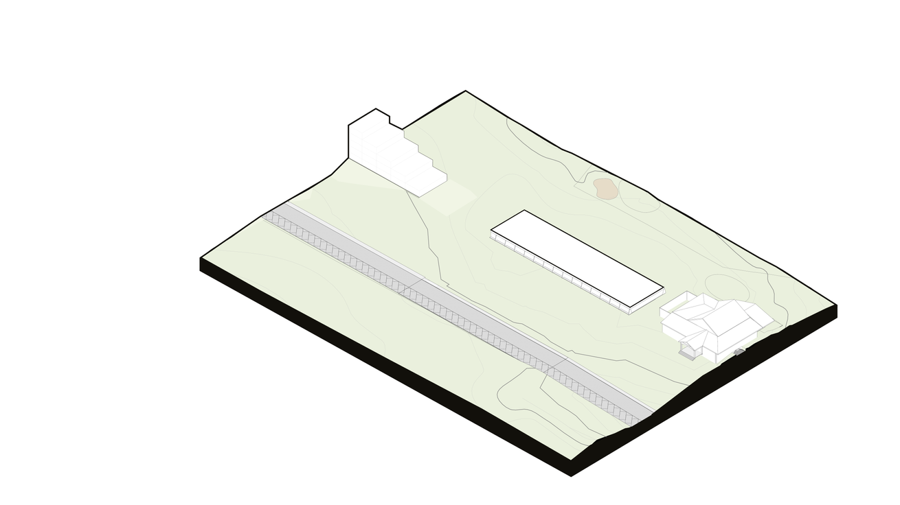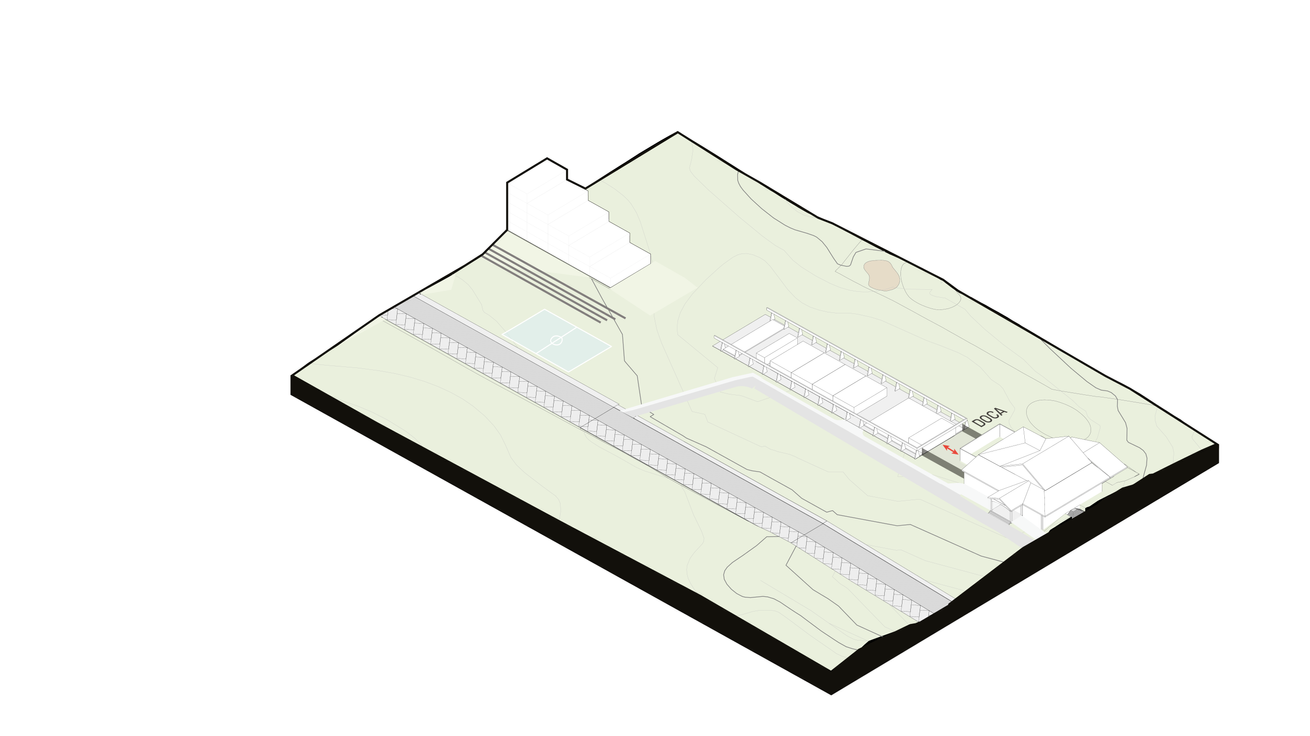 A volumetria da edificação estabelece uma conexão com as construções já existentes por meio de dois movimentos principais: o escalonamento, que aproxima a altura da casa pré-existente, e a flexão da barra, que orienta o observador para o interior do complexo.