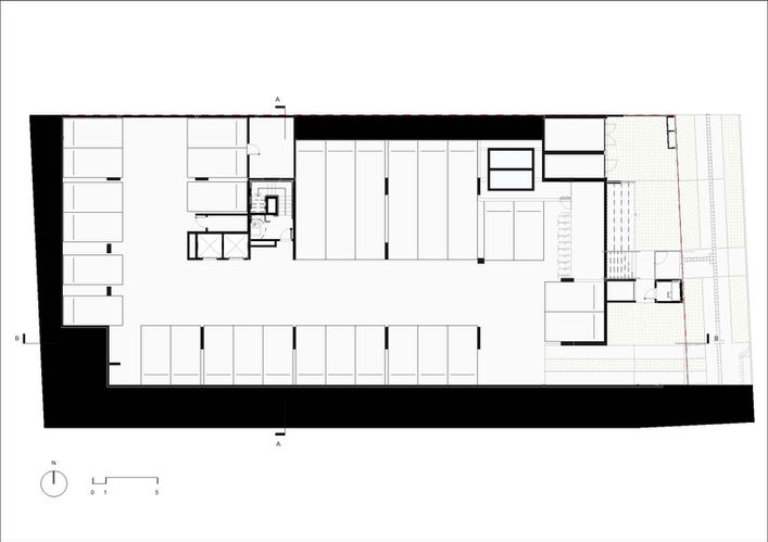 The ground floor of the building is elevated on pilotis and features an inviting grandstand nestled between the body of the edifice and the garden, serving as one of the connecting elements between the building and the neighborhood.