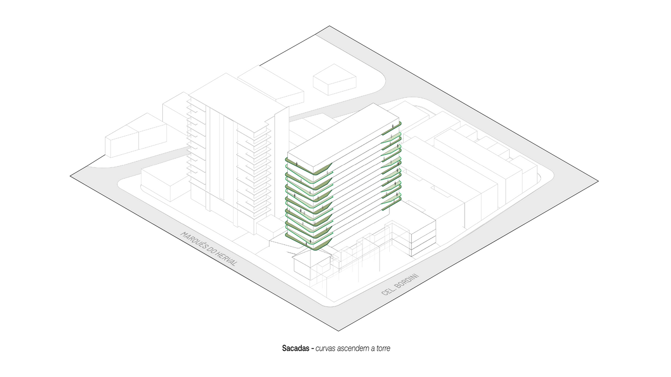 A torre se apoia em pilares inclinados, criando uma transição entre a dimensão monumental do edifício e a escala humana do pedestre. O percurso do acesso é marcado por pedras portuguesas e vegetação que conduzem o morador desde a calçada até o hall, configurado como praça de chegada.