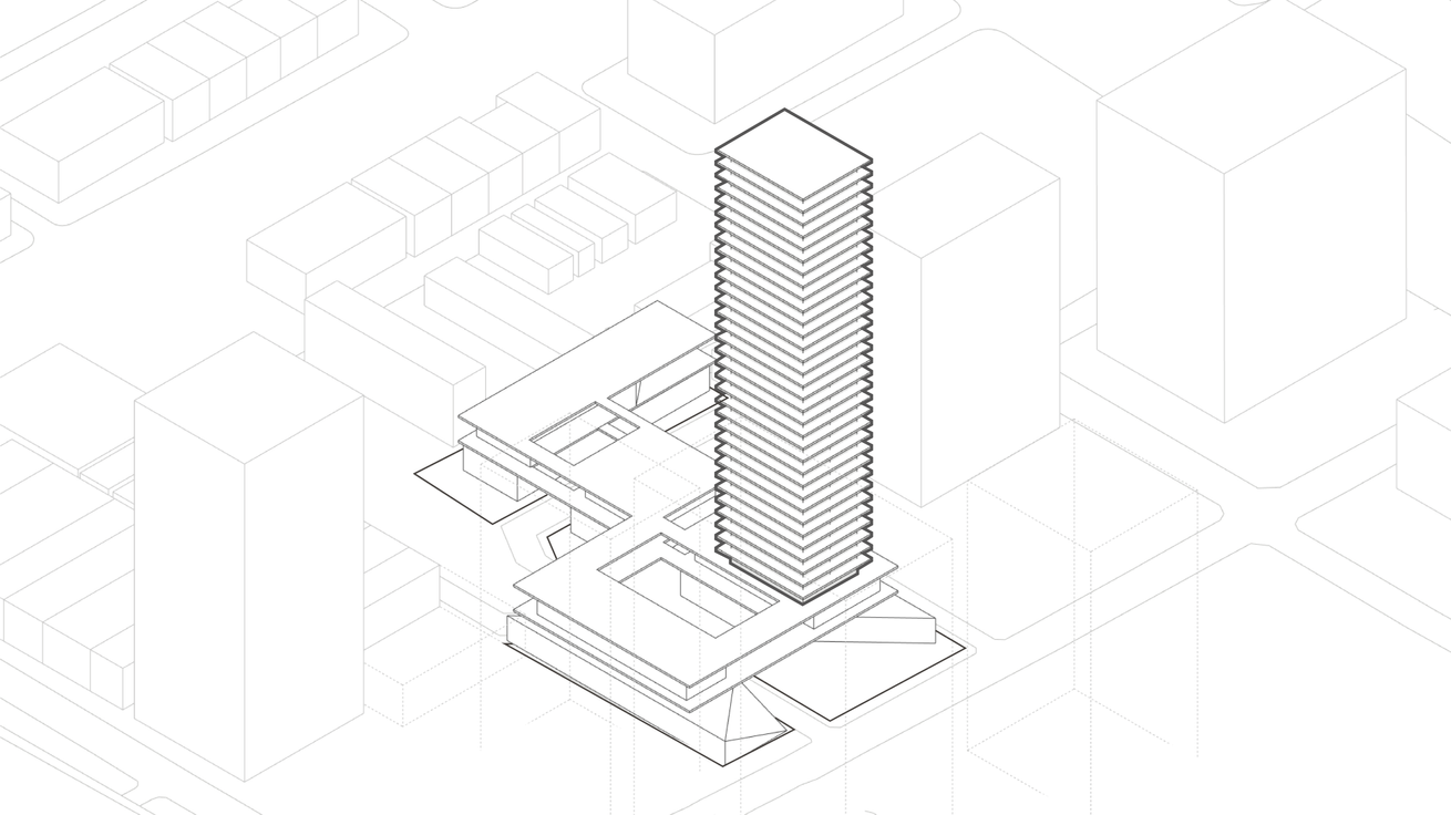 Pousada sobre essa placa, uma torre com 33 pavimentos para apartamentos com varandas propicia vistas para toda a região. Essa combinação de espaços abertos, comércio e habitação cria um ambiente dinâmico e integrado, contribuindo para a qualidade de vida dos usuários do empreendimento.